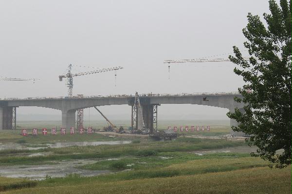 连镇铁路跨新沂河特殊孔跨群位于江苏省灌云县、灌南县交界处,总长度共计1268延米,其中T构648延米,连续梁620延米,共需混凝土2.3万方。为确保连续梁、连续T构、架梁等特殊孔跨、关键工序的安全质量可控,中铁十局连镇项目部成立了以项目经理为组长的特殊孔跨、关键工序专项检查小组,每周对连续梁挂篮施工、框架墩横梁施工、连续刚构施工、架梁施工、深基坑、脚手架、软基处理等特殊孔跨、关键工序进行监督检查。负责具体施工的三分部严格按照“高标准起步、高效率推进、高质量达标”的管理要求,科学组织、合理安排,充分调集人力物力,积极开展百日劳动竞赛,迅速掀起大干高潮,为特殊孔跨群合龙奠定了坚实的基础;全体参战人员发扬“知恩、感恩、报恩”的企业精神,不等不靠,打破常规,加班加点,快速完成临建、模板拼装、混凝土施工等关键工作,保质保量完成工期目标,为后续施工创造了有利条件。