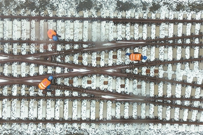 工人在常州地铁一号线南夏墅停车场铁轨上冒雪巡道。陈 暐摄 视觉江苏网供图