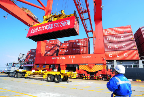 12月24日上午,在太仓港上港正和码头,一个挂有“太仓港2018年度第500万标箱”横幅的集装箱被缓缓吊起,稳稳地装上“海运远耀号”集装箱船,标志着太仓港集装箱年吞吐量突破500万标箱!“海运远耀号”汽笛长鸣庆祝。