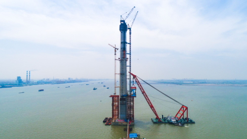 主航道桥采用两塔五跨斜拉桥设计方案,主跨1092米,塔高325米,桥梁的跨度和主塔的高度都打破了世界同类桥梁记录,采用了众多的新结构、新材料、新装备和新工艺,代表了世界斜拉桥建造技术的最高水平和发展方向。施工中首次采用Q500qE高强度钢及2000MPa级斜拉索新型材料,有效降低了结构自重,提升了桥梁力学性能,推动了国内特种钢产品升级和国产化进程;首次设计研发了2X1000吨架梁吊机,推动了工程装备行业技术研发和进步;首次采用主桥钢梁两节间全焊接、桥位整体吊装施工工艺,突破了单根杆件制作和安装的传统工艺,减少了吊装次数,提高了施工工效,体现了世界钢桥结构发展的“工厂化、装配化”发展方向,实现了钢梁架设的技术突破,提升了建桥技术和水平。