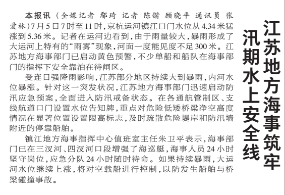 【中国水运报】江苏地方海事筑牢汛期水上安全线