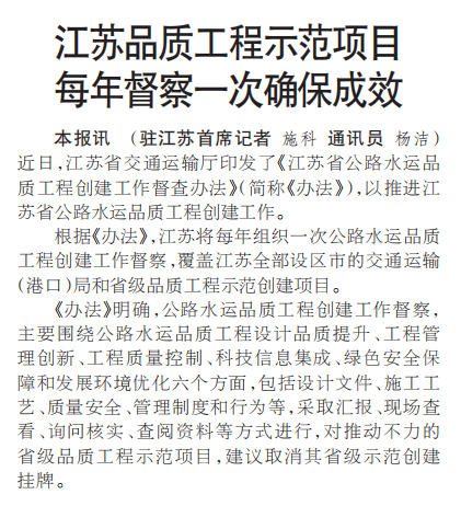 【中国交通报】江苏品质工程示范项目每年督察一次确保成效