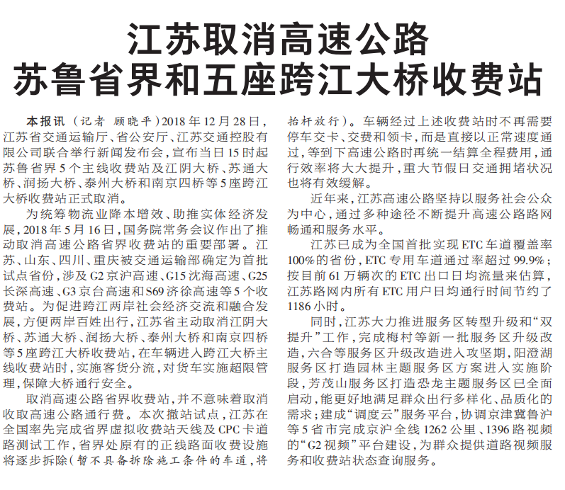 【中国水运报】江苏取消高速公路苏鲁省界和五座跨江大桥收费站