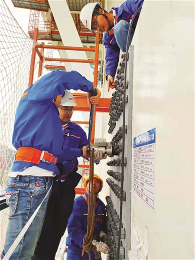 在高栓施拧过程中,技术人员全程参与,提供技术支持。同期,进行质量把关,确保五峰山长江大桥高栓施拧工作稳步推进,为后续钢梁架设做好铺垫。