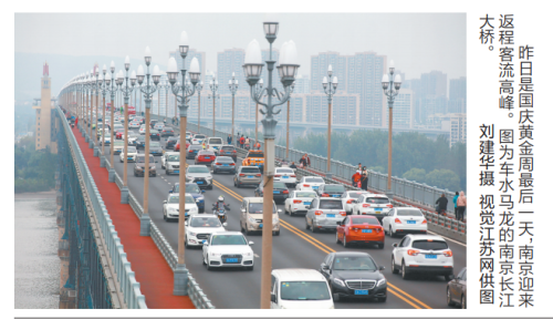 昨日是国庆黄金周最后一天,南京迎来返程客流高峰。图为车水马龙的南京长江大桥。 刘建华摄 视觉江苏网供图