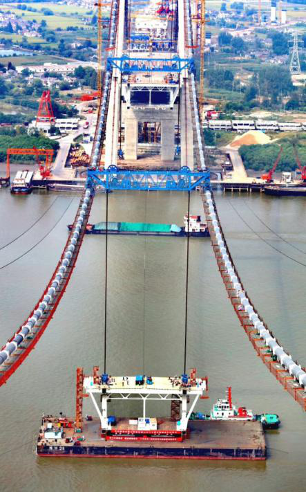 五峰山长江大桥中跨钢梁节段制作完成后,通过10000吨级的运梁船逆水行至待架梁段投影位置,精确对位后抛锚定位;待缆载吊机检查完成后下放吊具与钢梁吊耳连接,启动缆载吊机液压千斤顶收紧钢绞线,调整缆载吊机使各吊点受力基本一致,垂直起吊钢梁梁段提升钢梁至10m以上高度;接着再将运输船驶出钢梁架设区域,直至钢梁节段提升高出设计位置约10—20cm,停止钢梁节段提升。(省铁路办 镇铁办)