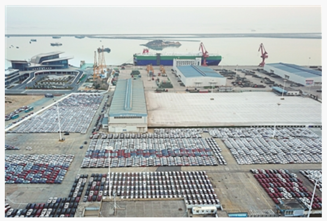 1月1日,连云港港口69号泊位,一批国产小轿车正在装船出口海外。新年伊始,大批国产小轿车陆续集结江苏连云港港口码头,分批装船出口海外,港口码头一片繁忙景象。耿玉和 摄