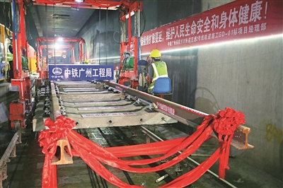 昨日,常州地铁二号线施工建设迎来重大节点,约39公里轨长的铺轨施工完成,实现全线“轨通”。图为工人在铺设最后一排钢轨。 陈 暐摄 视觉江苏网供图