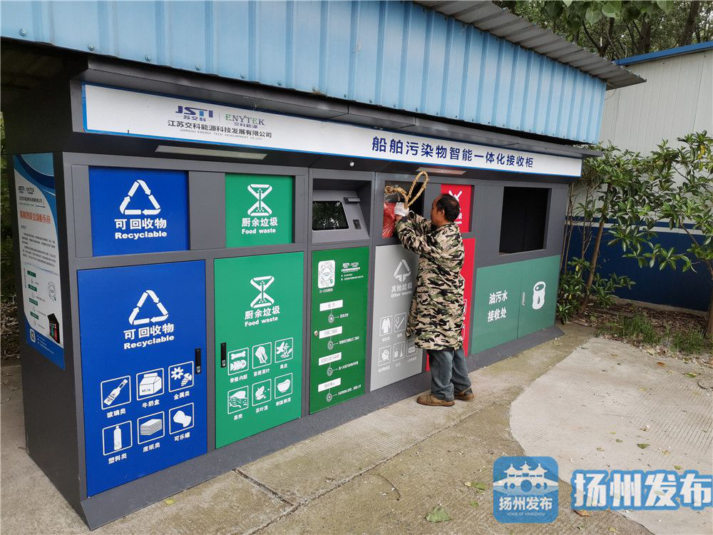 5月10日中午,在扬州市盐邵船闸上游远调站,来自山东的船民老张将船停靠在待航区后,从船上拿出几个垃圾袋上岸,快步来到墙边一组色彩缤纷的立柜前,打开手机内的“船舶污染物联单信息化平台”APP,对着墙上的二维码扫一扫,填报好相关信息,将垃圾袋分类放进垃圾柜中。整个过程不到1分钟,就实现了船舶垃圾的快速回收。