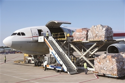 5月19日,南通兴东国际机场工作人员为飞往大阪的国际全货机装运防护服、口罩等货物。目前,兴东机场国际全货机周航班量达33架次, 创历史最高纪录。货运通航点城市包括仁川、首尔、大阪、东京和新加坡等地,自2月29日恢复国际全货机货运至今,国际货运量达2042吨。 许丛军 摄