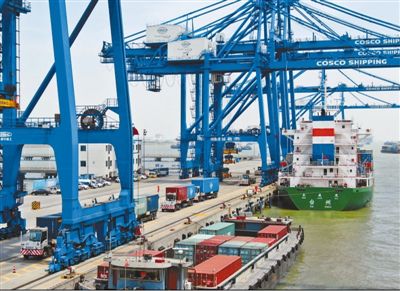 今年4月,江苏南通港完成港口货物吞吐量3428.1万吨,同比增长20.5%;今年前4个月累计完成10392.2万吨,同比增长11.7%,已突破亿吨关口。图为5月19日拍摄的南通港通海港区集装箱作业区的画面。 许丛军摄(影像中国)
