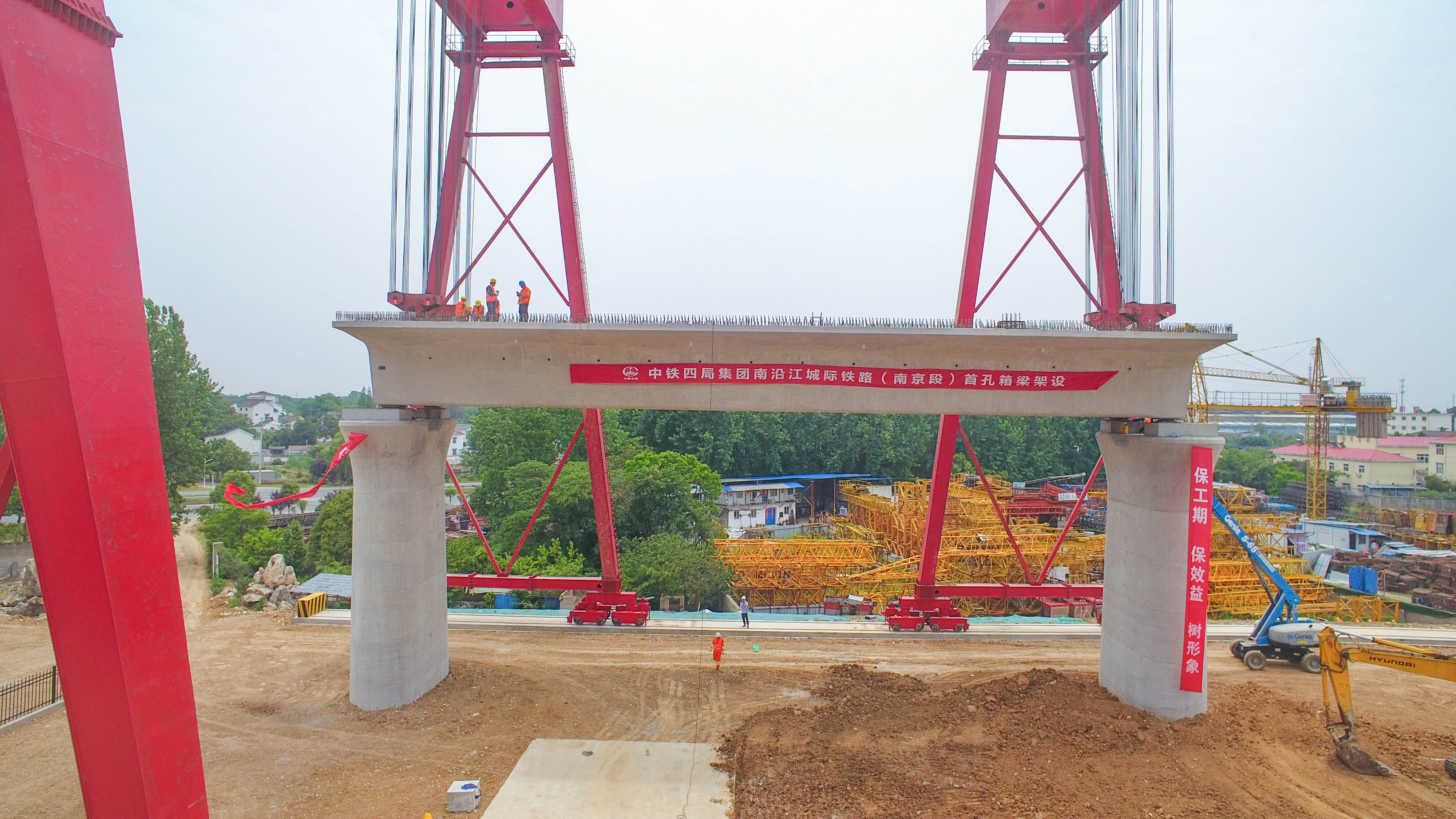 5月27日上午11时,随着现场指挥一声令下,由中铁四局四公司江宁制梁场生产的32米箱梁稳稳地架设在了句容1号特大桥上,中铁四局南沿江城际铁路项目完成了南京段首榀箱梁架设,标志着南沿江城际铁路南京段正式进入桥梁架设新阶段。