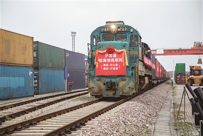昨日下午,一列满载家具、太阳能电子板等出口货物的铁海快线班列驶出海安铁路物流基地,驶往上海洋山港和浙江宁波港。这是沪苏通铁路开通以来当地首列铁水联运班列。 翟慧勇摄 视觉江苏网供图