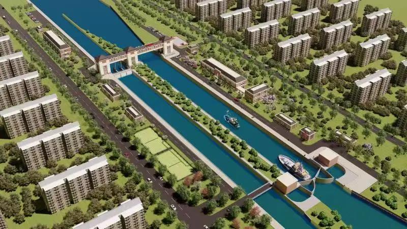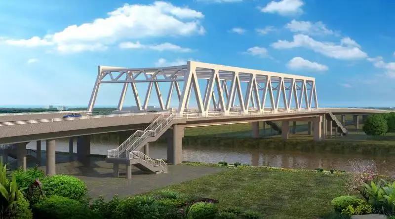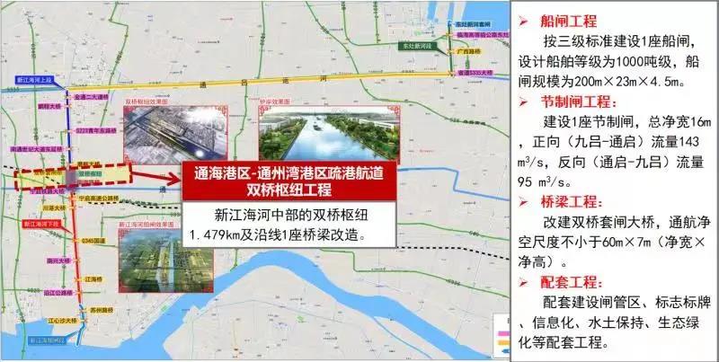 双桥枢纽及套闸桥位于新江海河航道川姜镇区,是通州湾新出海口疏港航道的重要组成部分,设计范围约1.5公里,其中船闸水工工程包括上、下闸首各1座,200米长闸室1座,上下游导航、调顺段和停泊段、隔流堤;节制闸工程包括总净宽16米的闸室及上下游右侧护岸、防冲槽、海漫、消力池,以及土方、机电和金属结构等配套工程。双桥套闸大桥主桥采用88.8米跨径的简支下承式钢桁架,引桥采用现浇预应力混凝土连续箱梁。