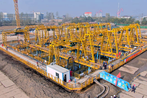 龙潭长江大桥采用主跨1560米的钢箱梁悬索桥,其南锚碇是陆地超大规模沉井基础,沉井尺寸为73.4米×56.6米×50米、多井孔(30个井孔)结构,沉井下沉深度达50多米,下沉至-46米标高,平台面积相当于10个标准篮球场大小。沉井施工分为三次接高、三次下沉,最终下沉至地面以下50多米。