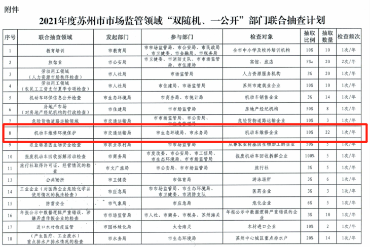 苏州市交通运输局综合执法支队不断完善以“双随机、一公开”为基本手段、以重点监管为补充、以信用监管为基础的新型监管机制,严格按照《2021年苏州市市场监管领域“双随机、一公开”监管工作要点》和《2021年度苏州市市场监管领域“双随机、一公开”部门联合抽查计划》文件要求,按照联合抽查计划,结合苏州市汽车维修行业环境保护大排查大整治方案要求,积极推进机动车维修环境保护多部门联合监管工作。