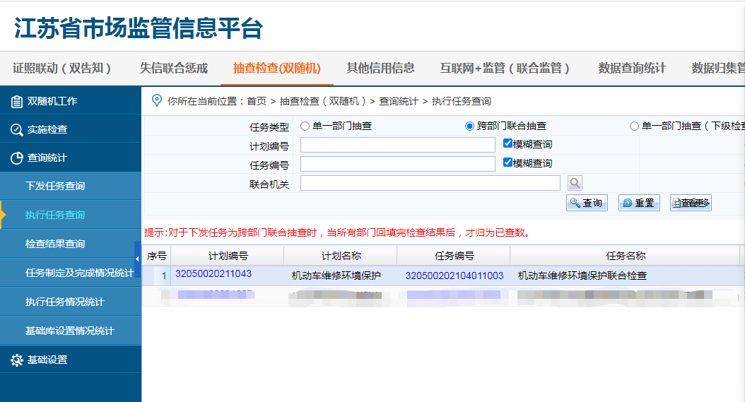 依托省市场监管信息平台实施“一单两库”维护,即抽查事项清单、企业名录库和执法检查人员名录库,由市执法支队牵头,首次随机抽取机动车维修环境保护联合抽查企业,抽取了2家机动车维修企业和6名分别来自交通运输、生态环境和水务部门的检查人员,并创建联合抽查任务。