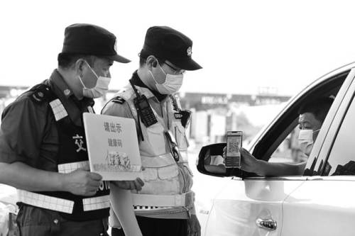 南京市公安局交管局高速公路九大队民警、南京市江宁区交通运输局工作人员查验离宁人员健康码 赵亚玲 摄