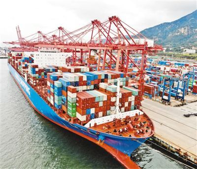 图为9月4日,一艘远洋运输轮在连云港港集装箱码头装载货物。