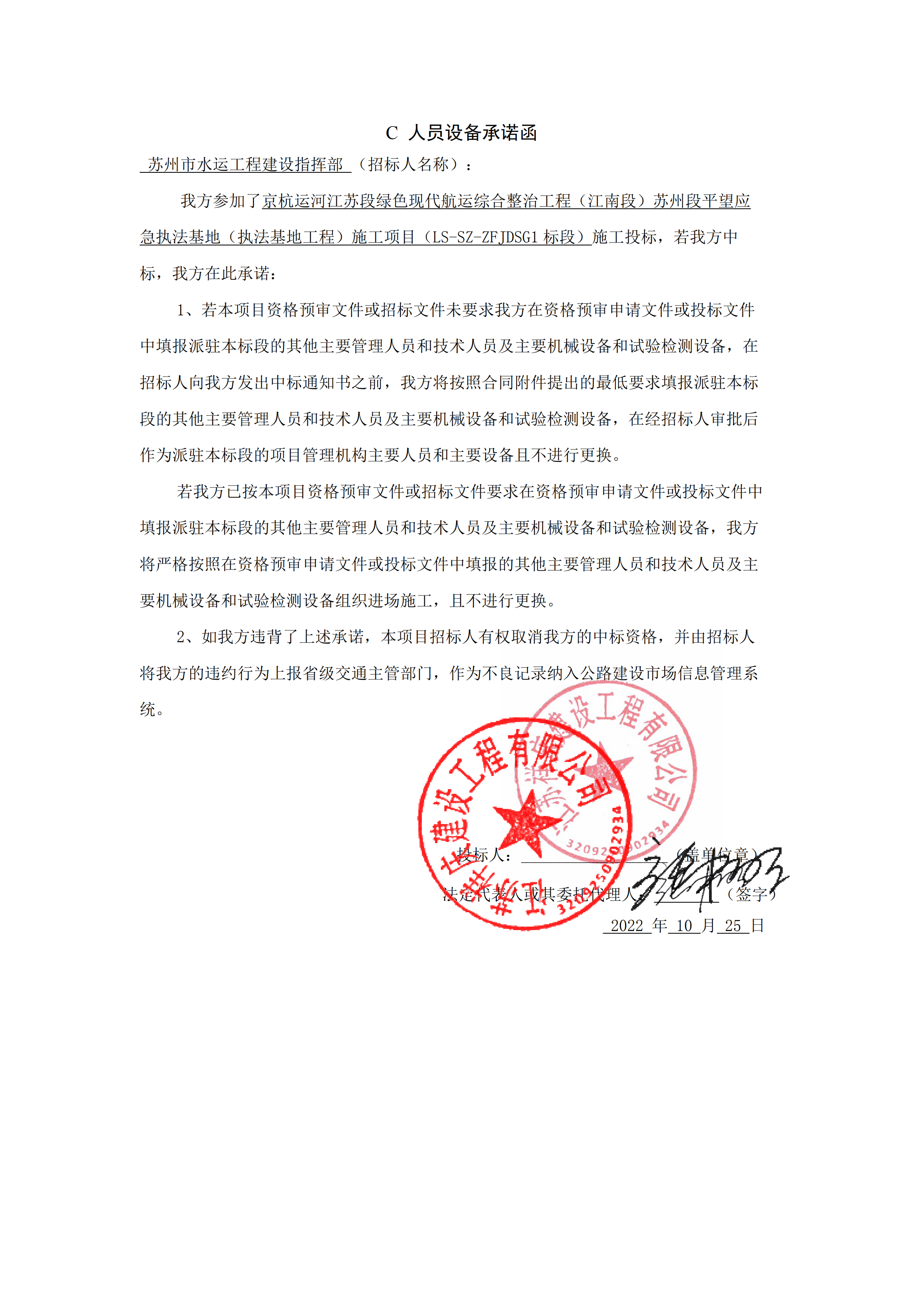 苏州市港航事业发展中心公示人员设备承诺函(江苏祥庆建设工程有限公司)