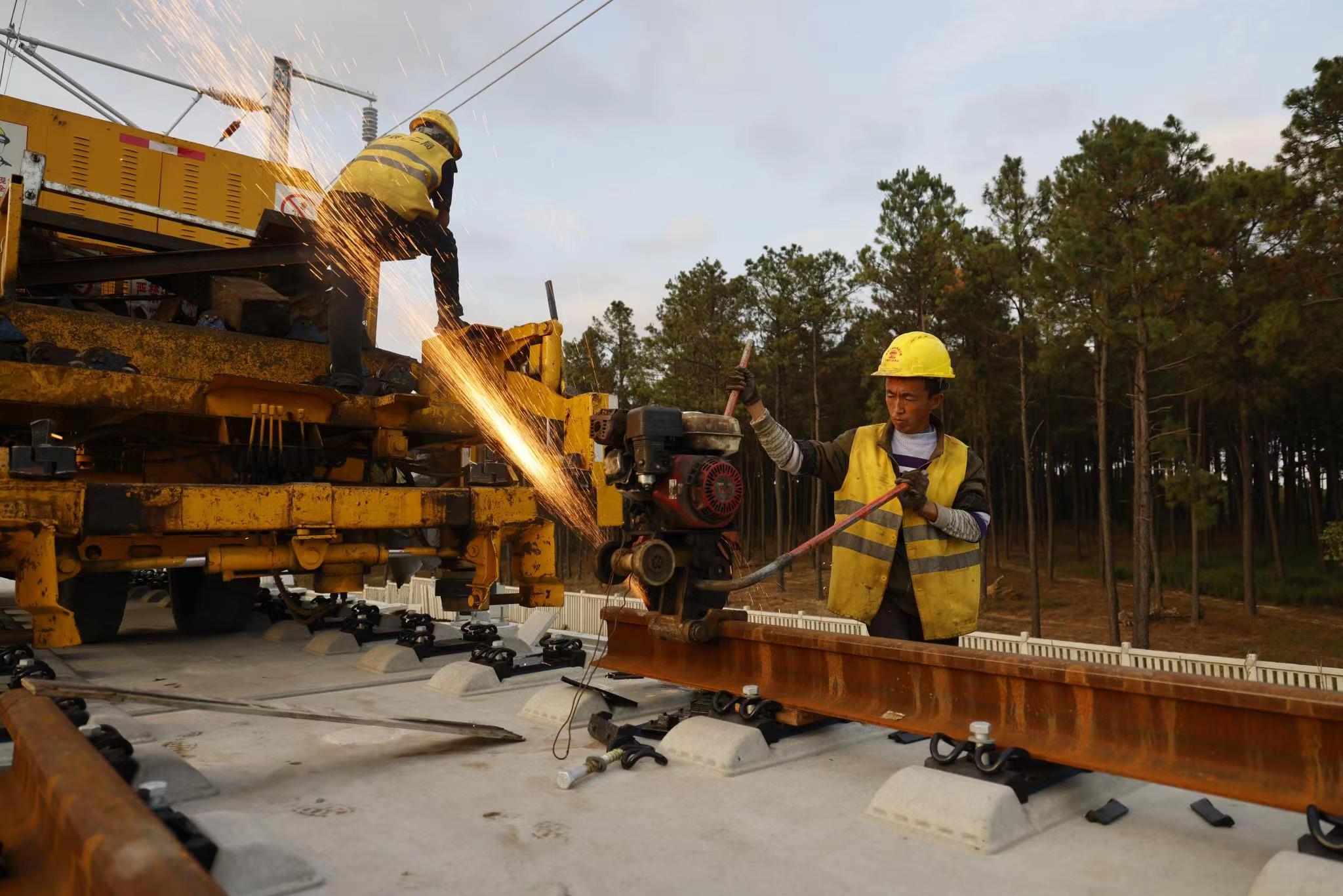近日,一对500m长钢轨顺利穿越南沿江铁路阳山隧道,平稳铺设在无砟轨道板上,这标志着南沿江城际铁路铺轨进入句容,向着明年建成通车又迈出了坚实的一步。