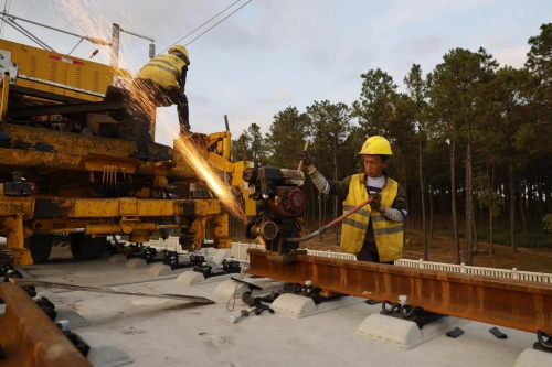 南沿江铁路铺轨采用2台TC-500型铺轨机双向同时铺设,上下行线路的铺设同步进行,同时加持智能行车调度指挥系统,全天候对铺轨机、长轨运输车、焊轨车等设备的运行状态及作业位置进行监控和统一调度指挥,保证了交叉施工安全有序,并且提高了铺轨速度,每天铺轨可达6公里。预计句容段铺轨将于本月完成。