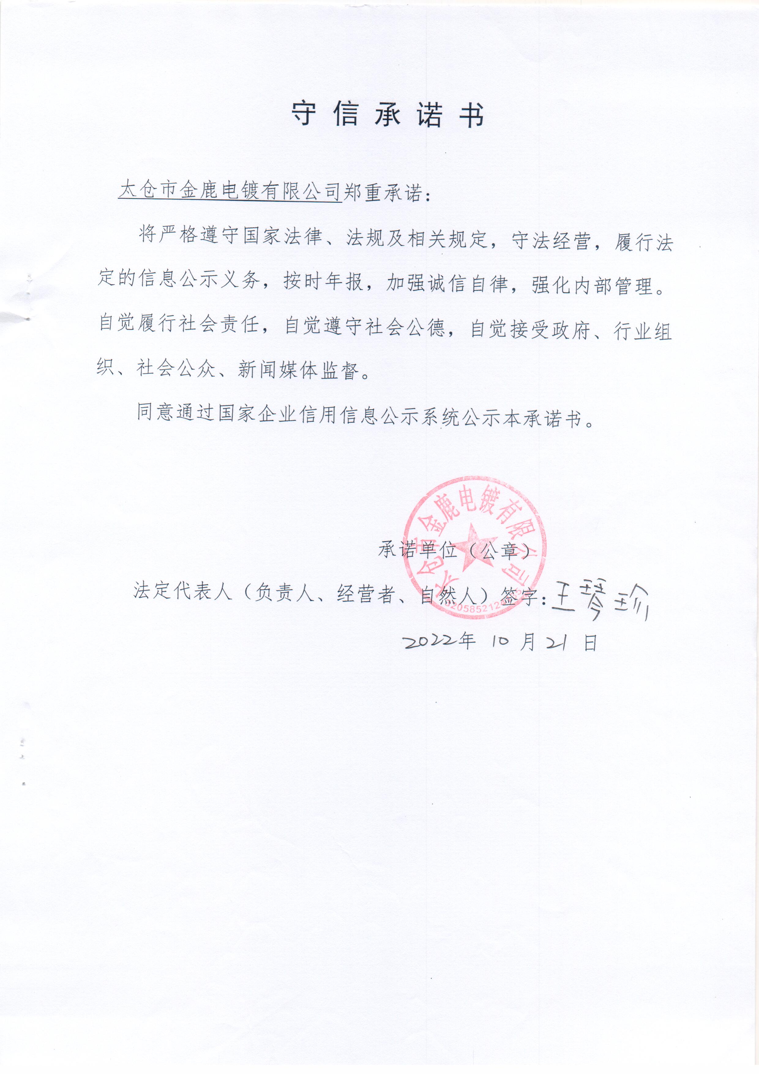 苏州太仓市交通运输局公示守信承诺书(太仓市金鹿电镀有限公司)
