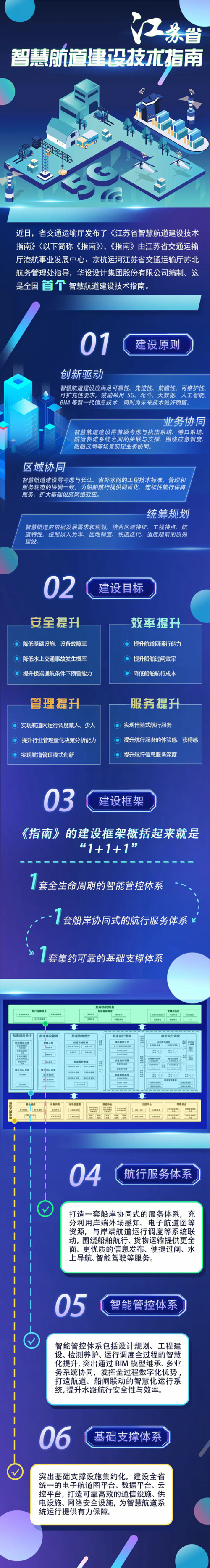 《指南》在总结成熟技术、融合先进技术、加强前沿技术和参考现有标准的基础上编制完成,创新提出了江苏省智慧航道的建设目标、建设框架和建设内容,强调了全方位、全覆盖、全周期和全行业发展理念,满足新基建背景下航道规划设计、施工建设、检测养护、运行调度、航运服务等方面智慧化建设的需求,同时规范了融合通信、电子航道图、数据中台、云控平台和网络安全等支撑保障要求。