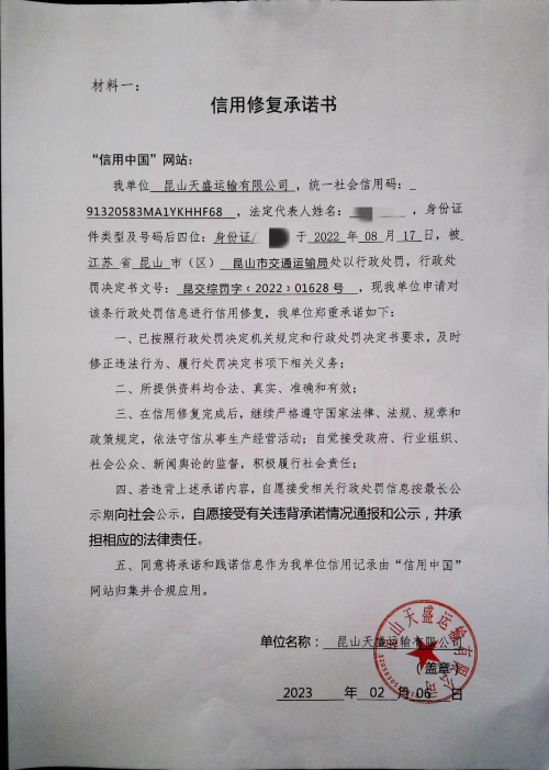 苏州昆山市交通运输局公示信用修复承诺书(昆山天盛运输有限公司)