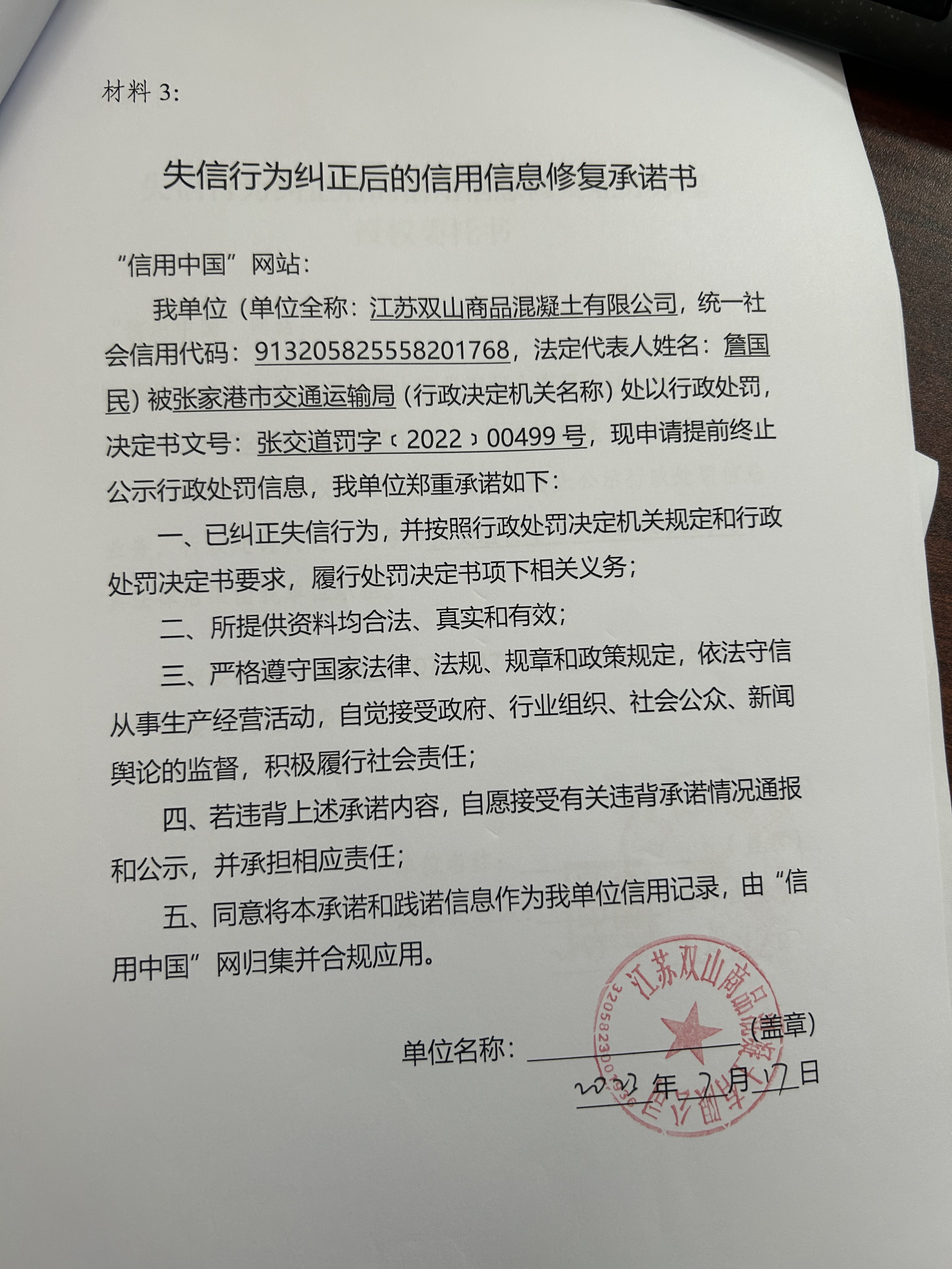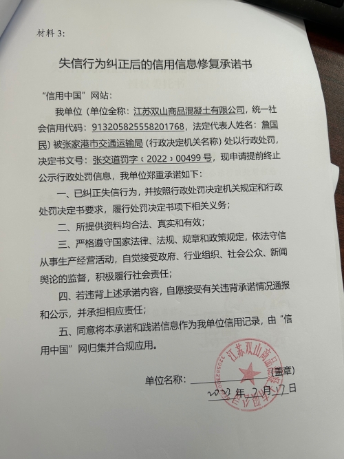 苏州张家港市交通运输局公示失信行为纠正后的信用信息修复承诺书