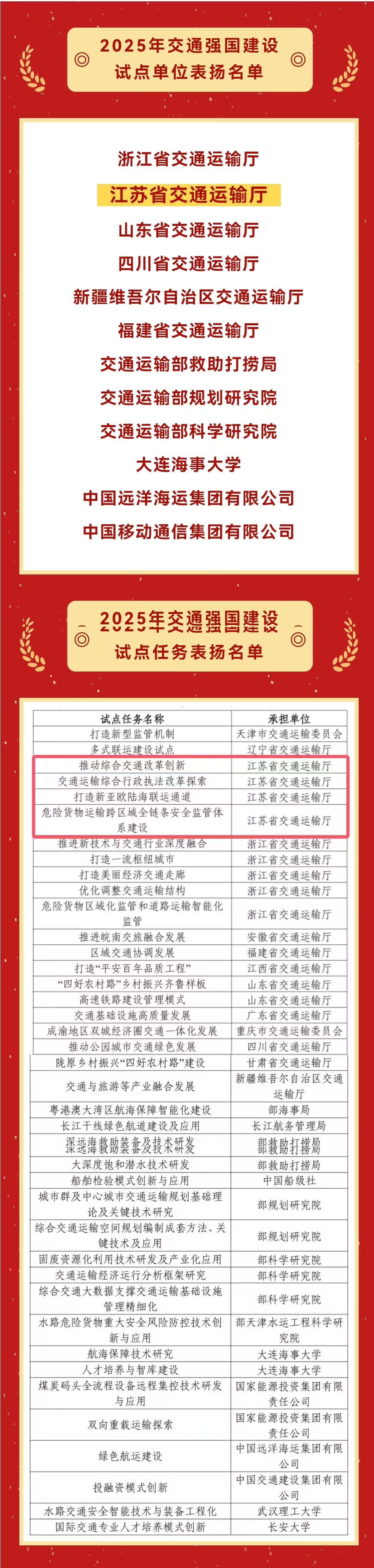 交通运输部从2025年7月底前完成验收评估的87项试点任务中,综合评价任务实施效果、创新引领水平及推广应用情况等因素,决定对浙江省交通运输厅“推进新技术与交通行业深度融合”、江苏省交通运输厅“推动综合交通改革创新”、山东省交通运输厅“高速铁路建设管理模式”等40项试点任务进行表扬。