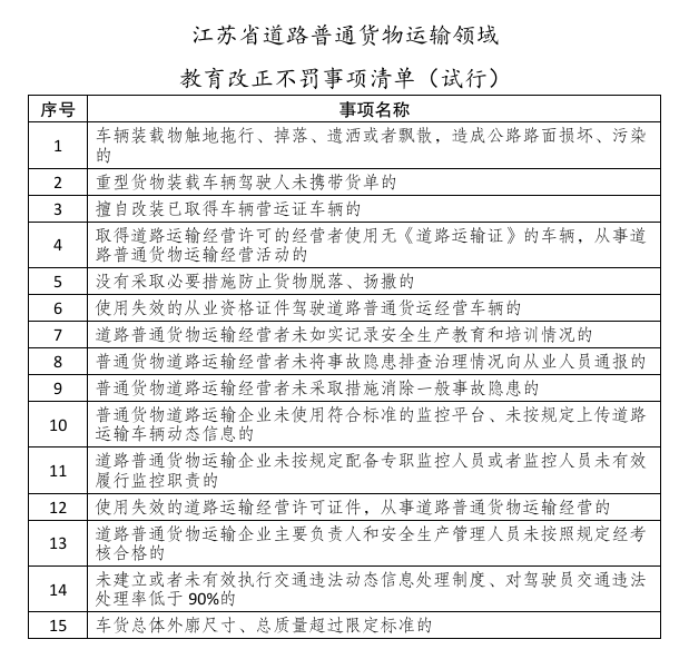 近日,省交通运输厅印发《关于在道路普通货物运输执法领域实施教育引导工作的通知》(以下简称《通知》),并随文印发《江苏省道路普通货物运输领域教育改正不罚事项清单(试行)》(以下简称《清单》,具体内容附后),将于2025年12月1日起施行。