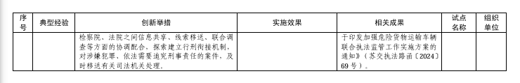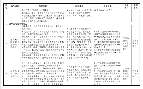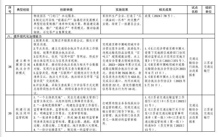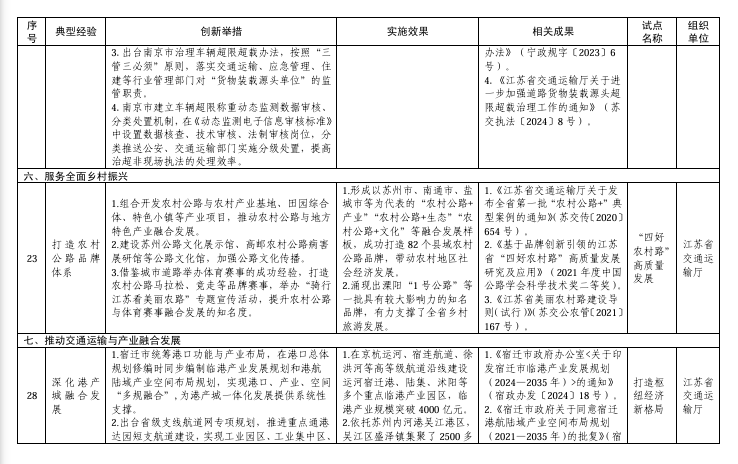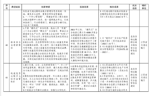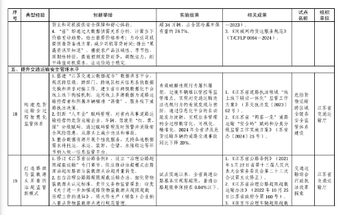 其中,在建设现代化交通基础设施方面,协同联动推进枢纽城市建设典型经验入选;在提升交通运输服务能力方面,构建“多快好省”特色冷链物流优质服务生态典型经验入选;在提升交通运输安全管理水平方面,构建危货运输全过程智慧化监管体系、打造路面与装载源头并重的治超监管新模式等2项典型经验入选;在服务全面乡村振兴方面,打造农村公路品牌体系典型经验入选;在推动交通运输与产业融合发展方面,深化港产城融合发展典型经验入选;在提升现代化治理能力方面,建立都市圈跨区域执法合作新模式、构建行政执法闭环监管机制、探索安全治理新路径、构建危货运输多元协同监管体系等4项典型经验入选。