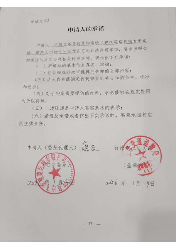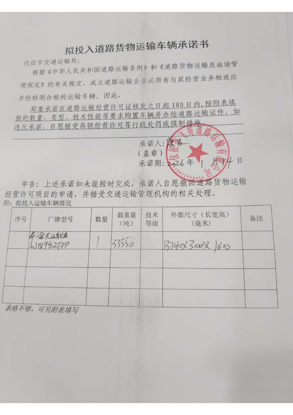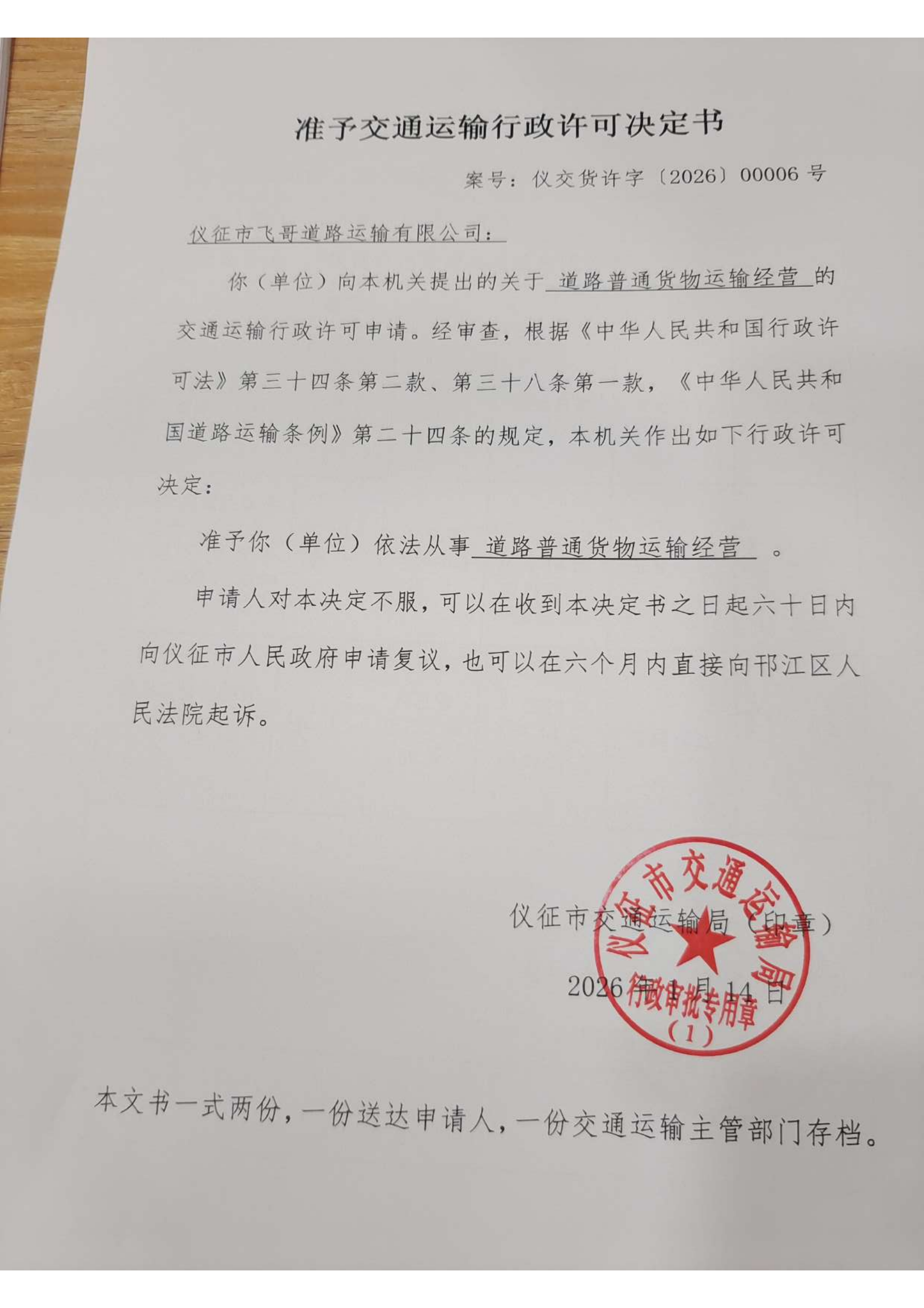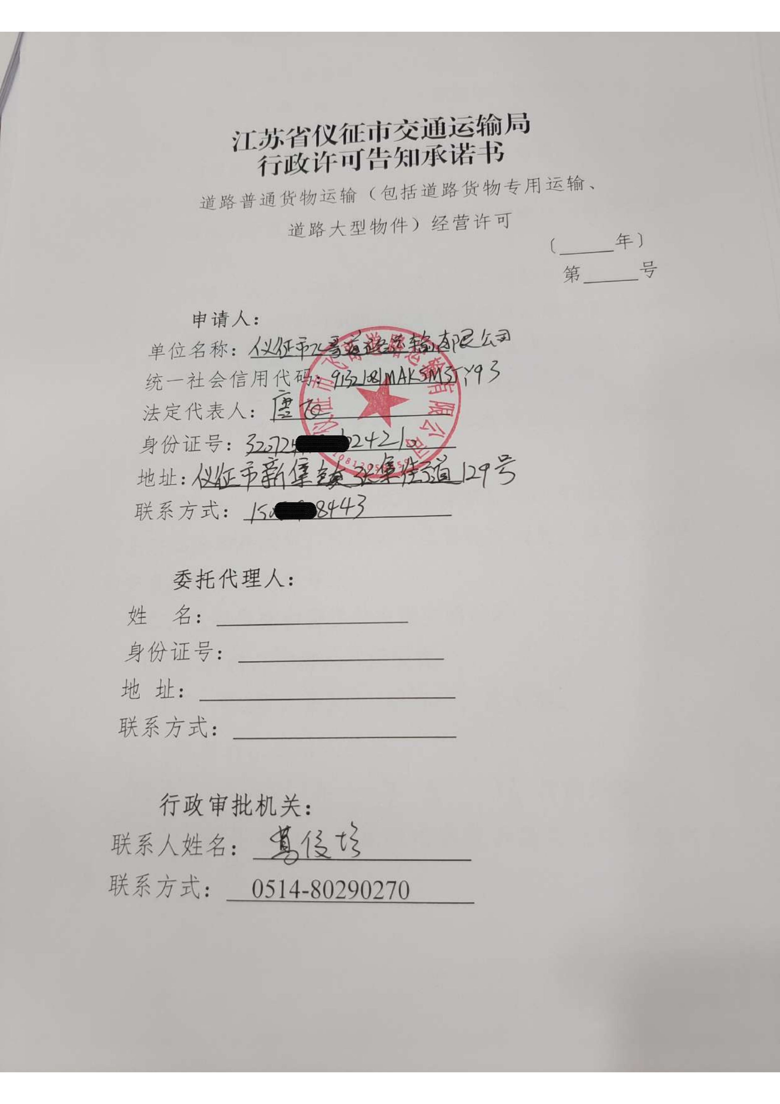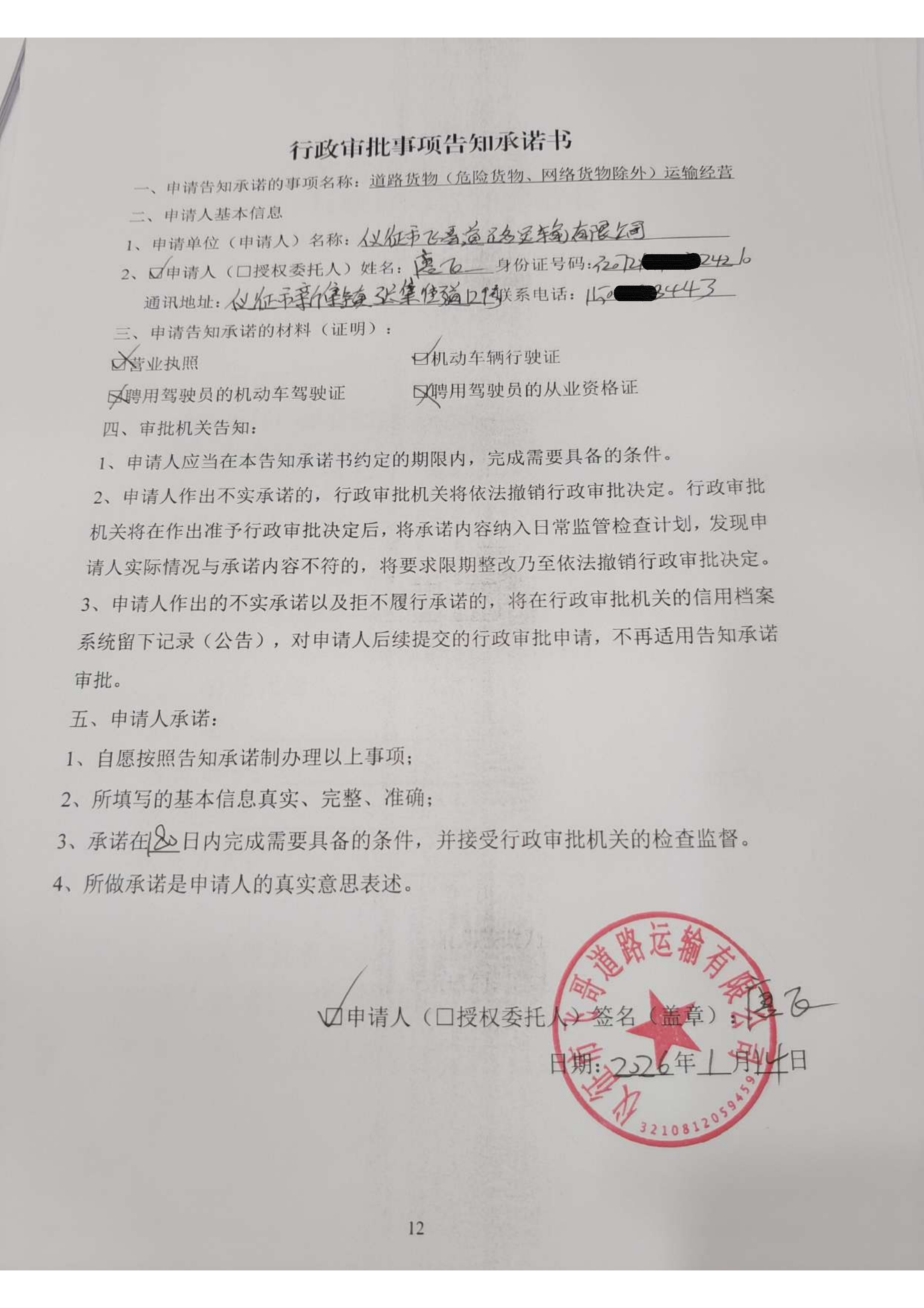 扬州市仪征市飞哥道路运输有限公司交通运输行政审批告知承诺