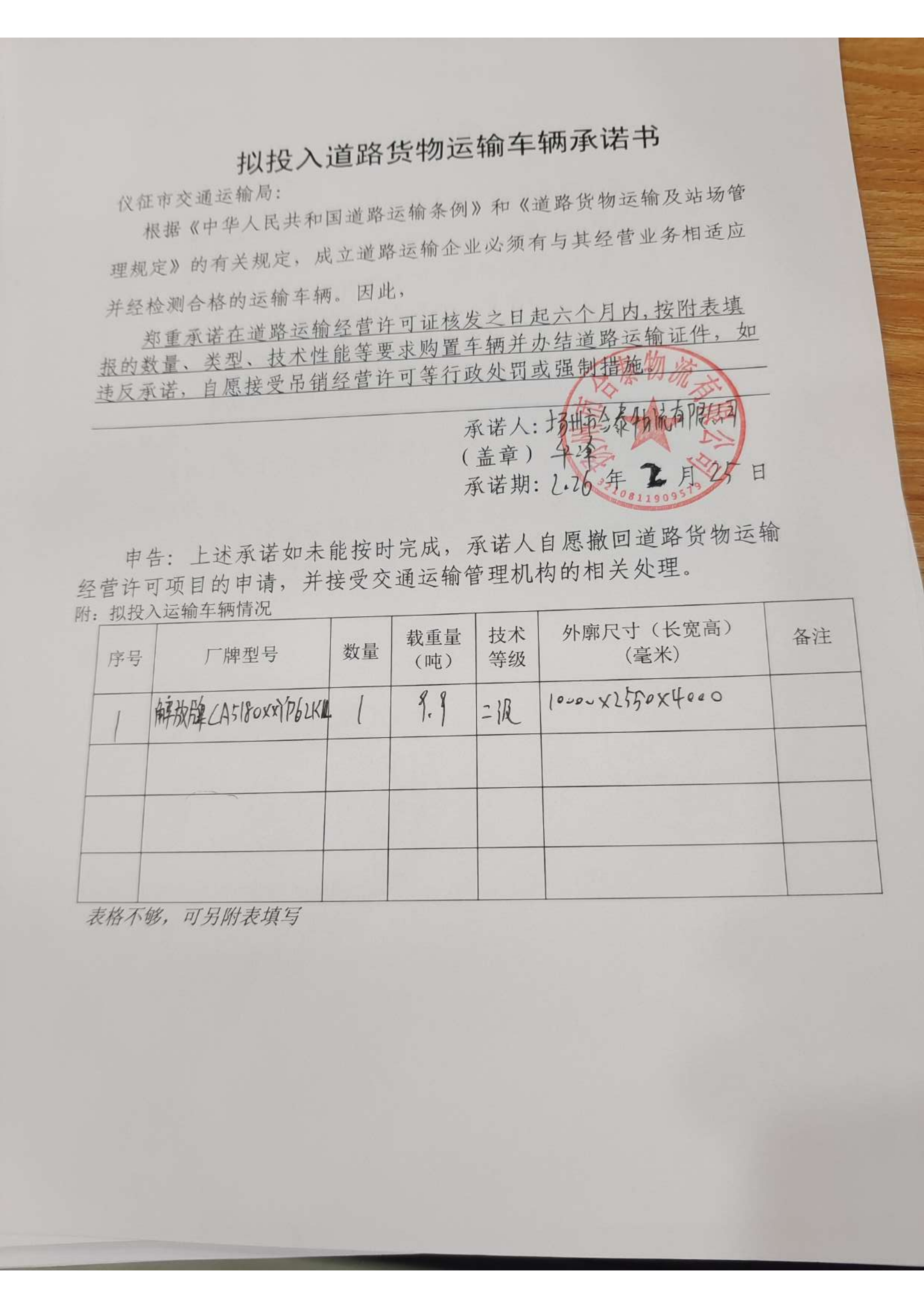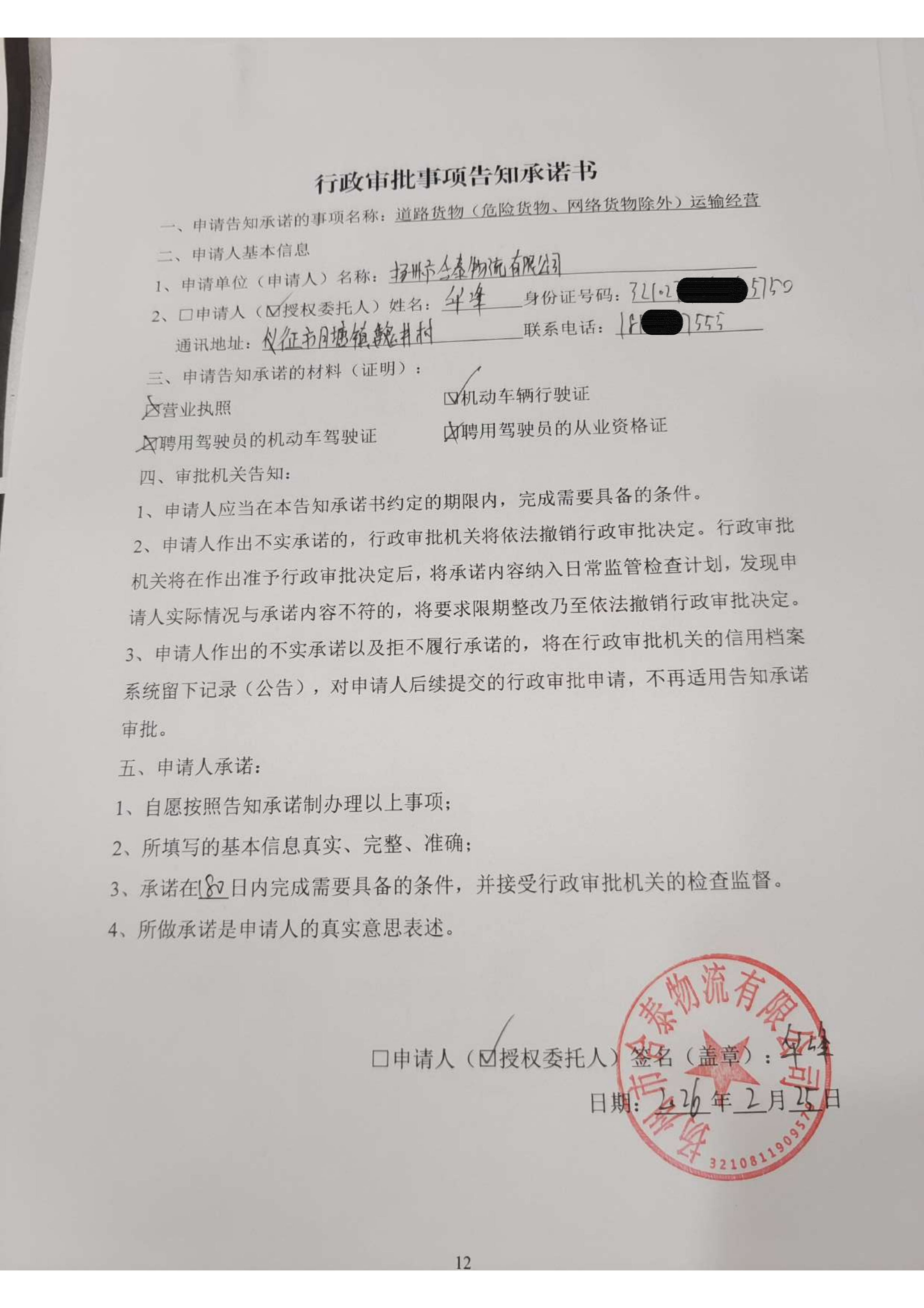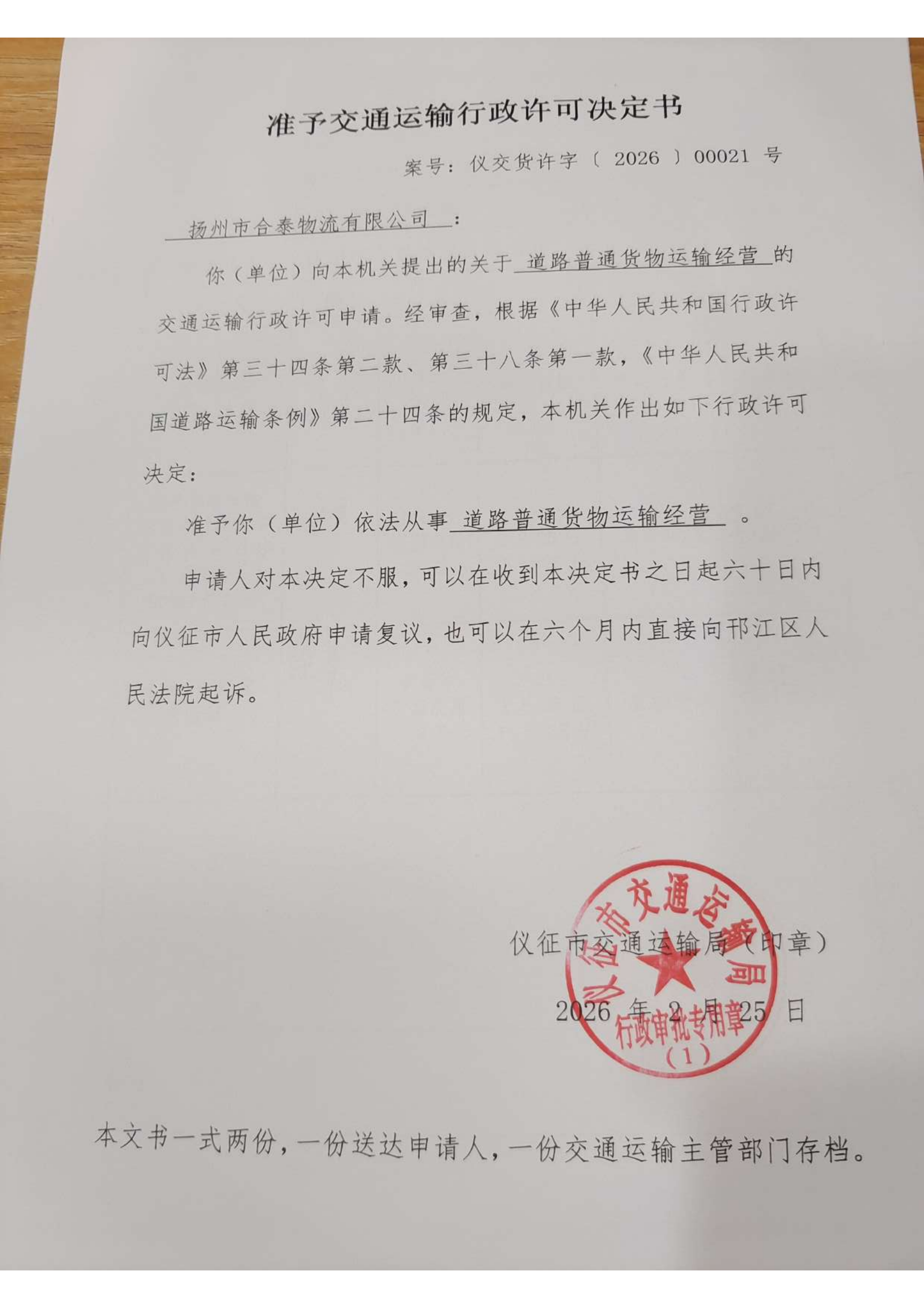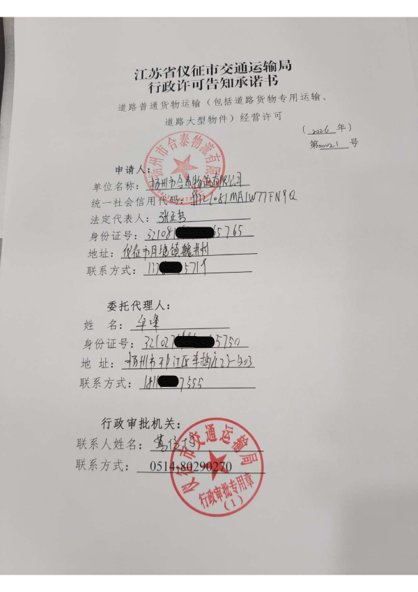 扬州市合泰物流有限公司交通运输行政审批告知承诺