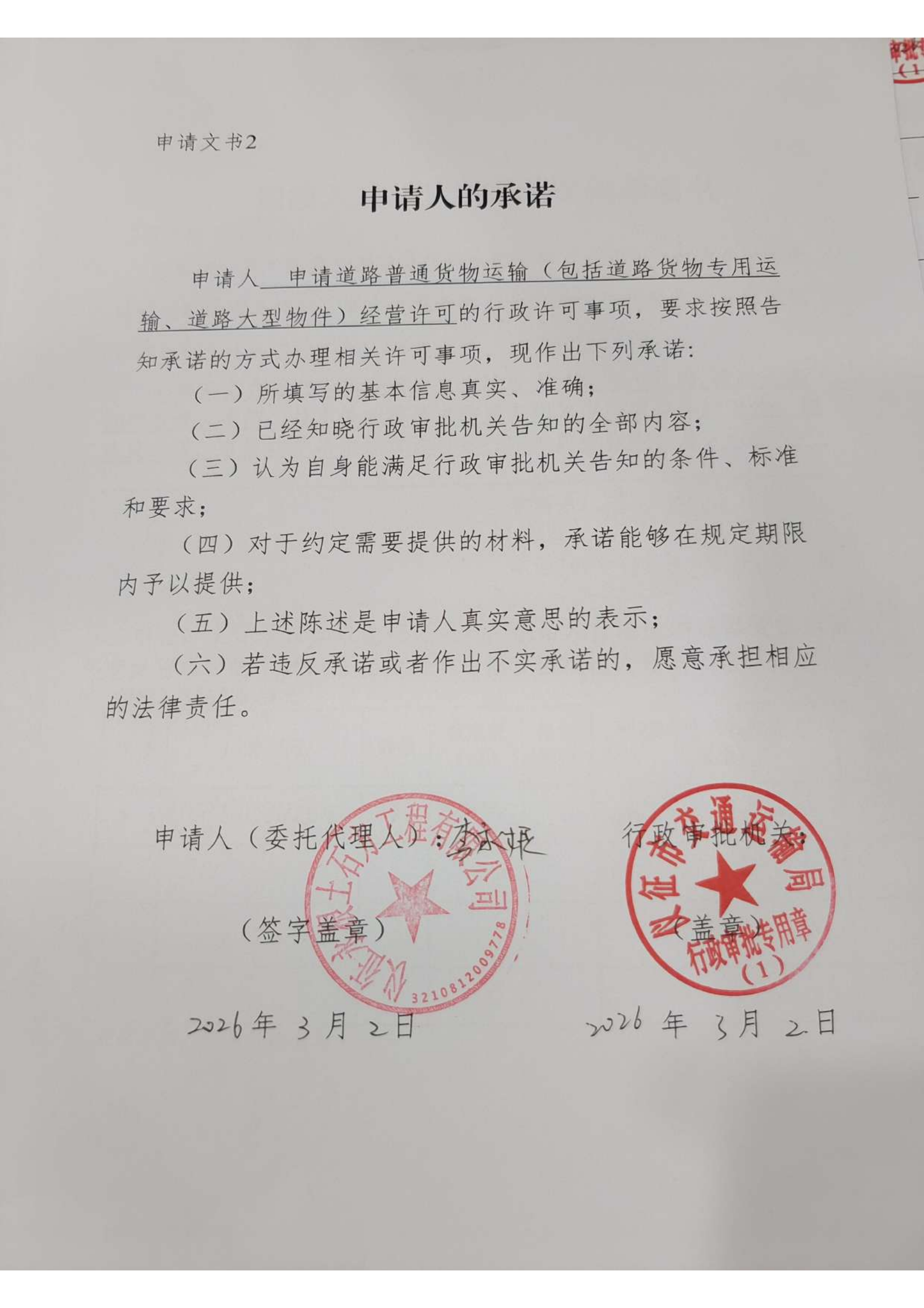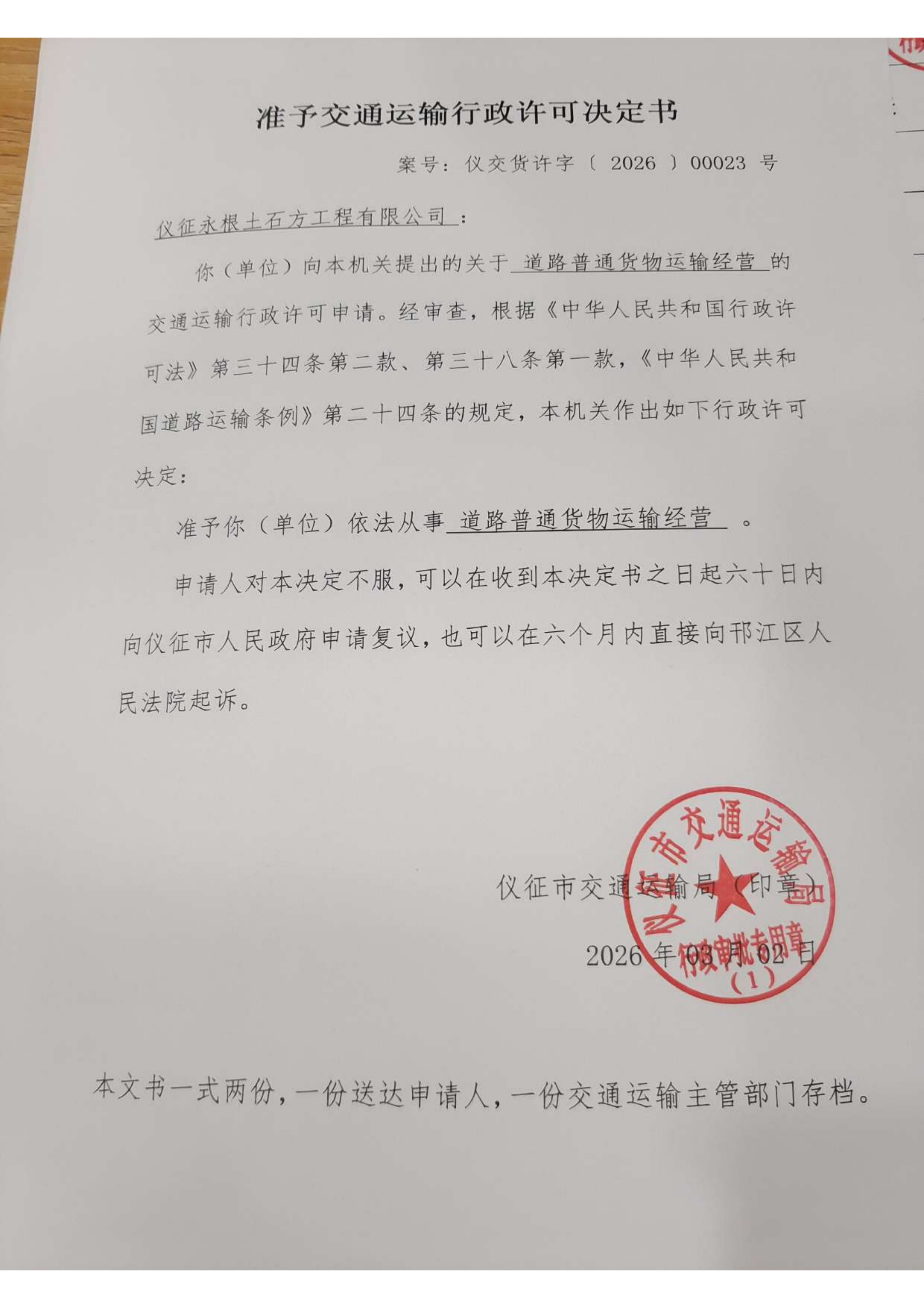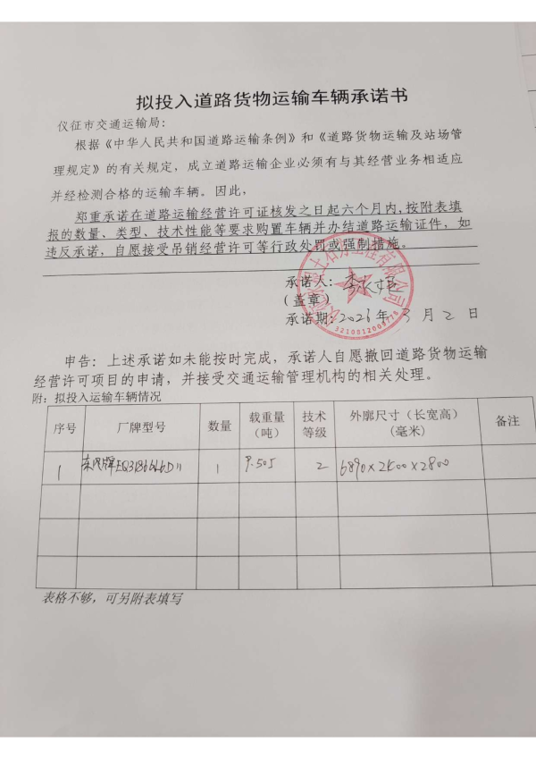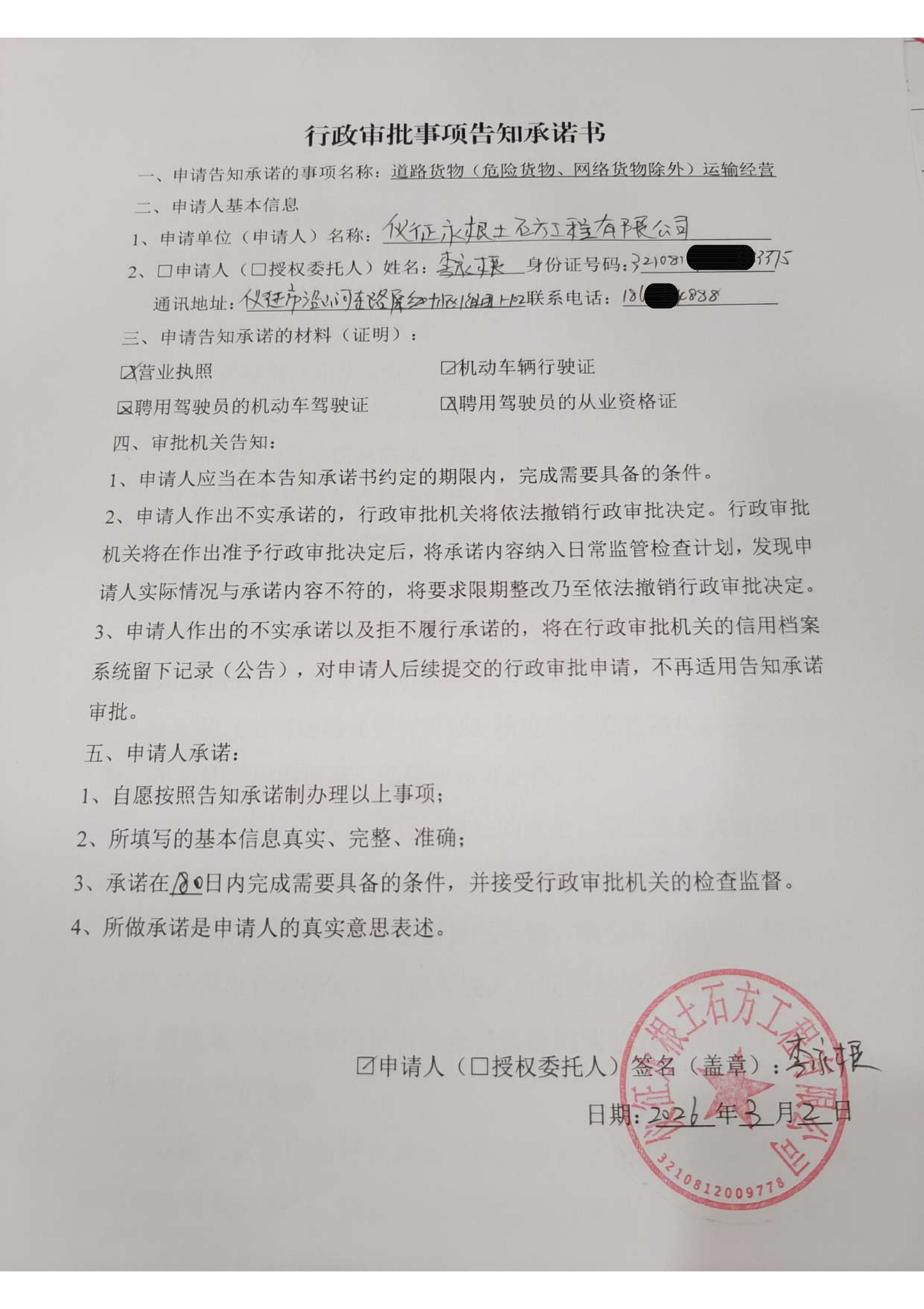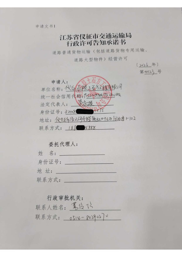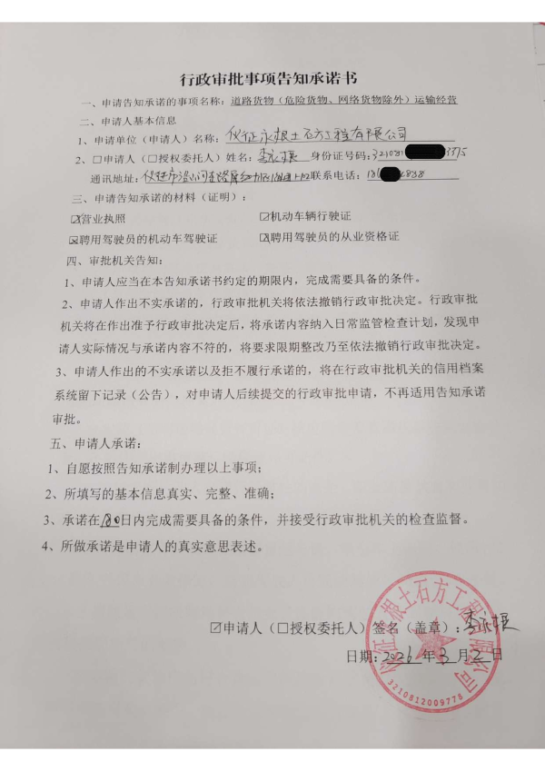 扬州市仪征市永根土石方工程有限公司交通运输行政审批告知承诺