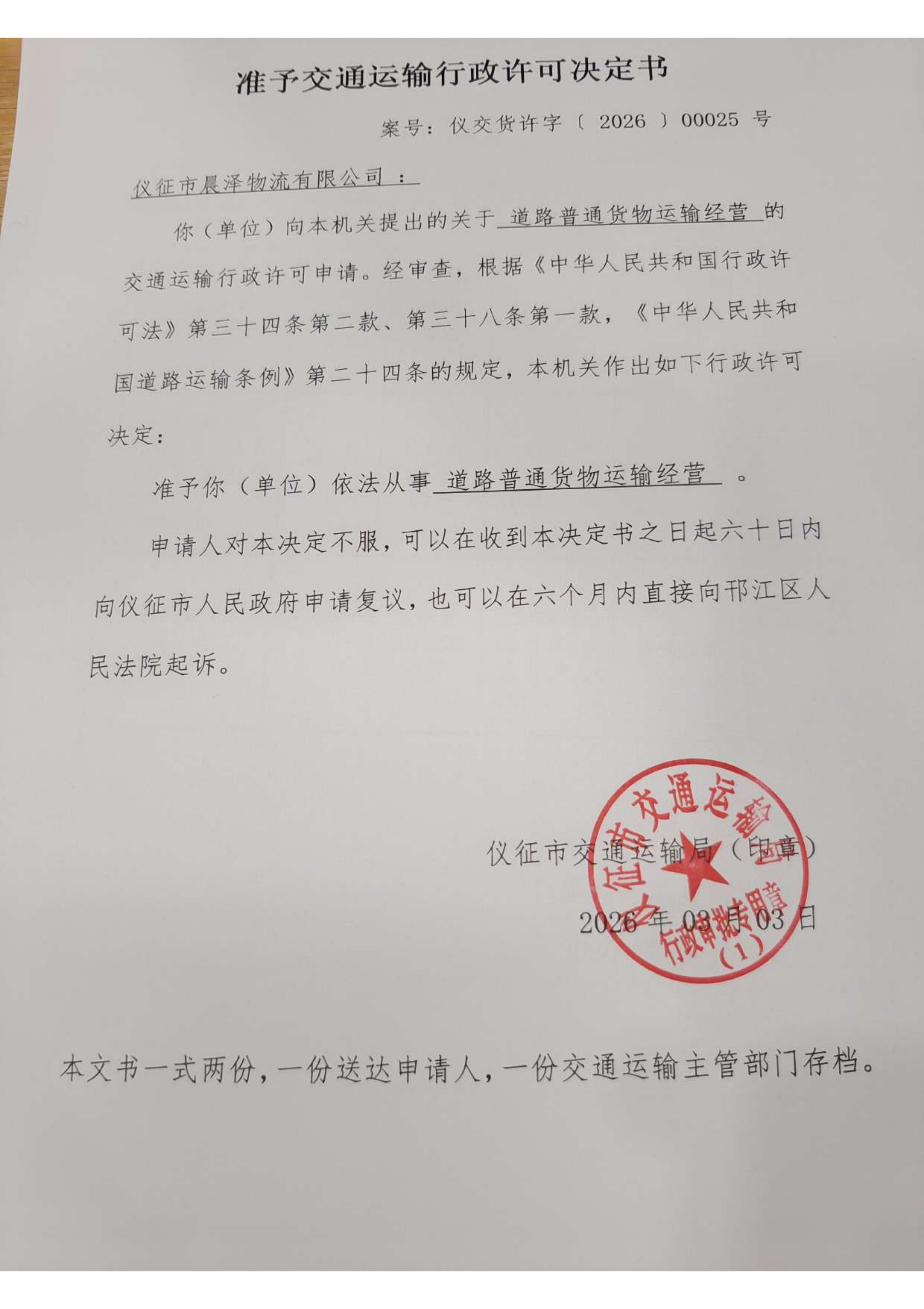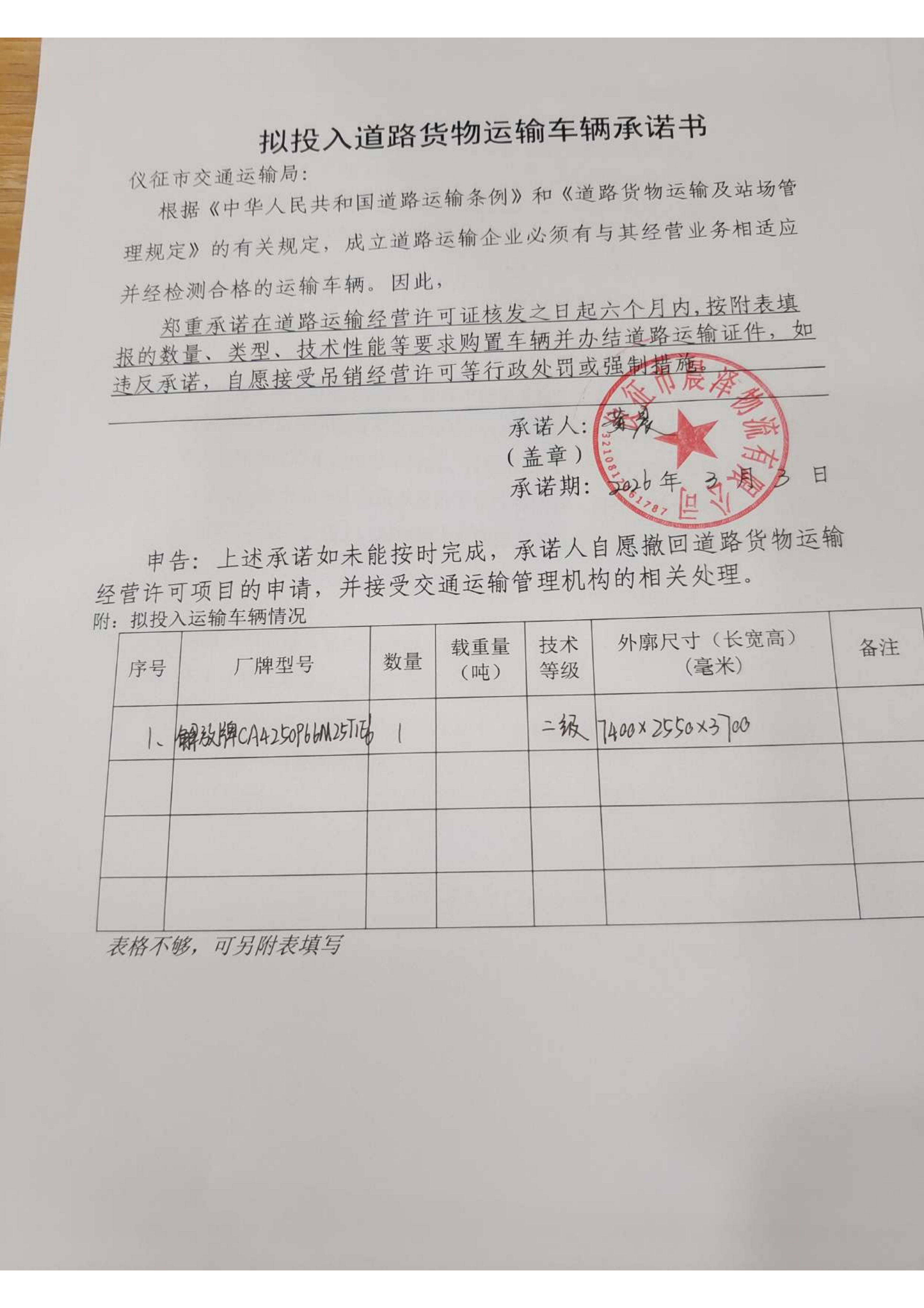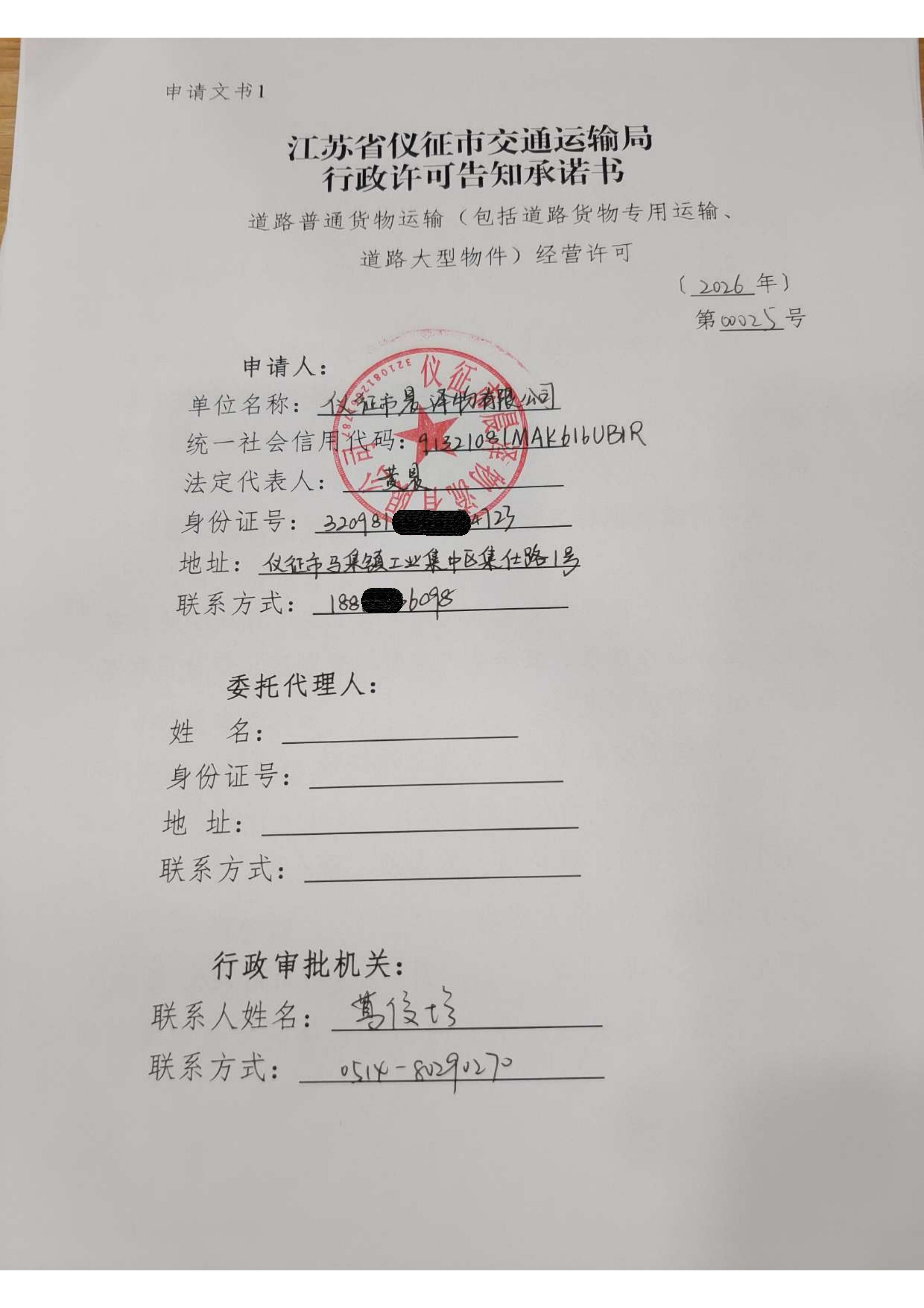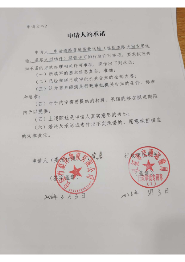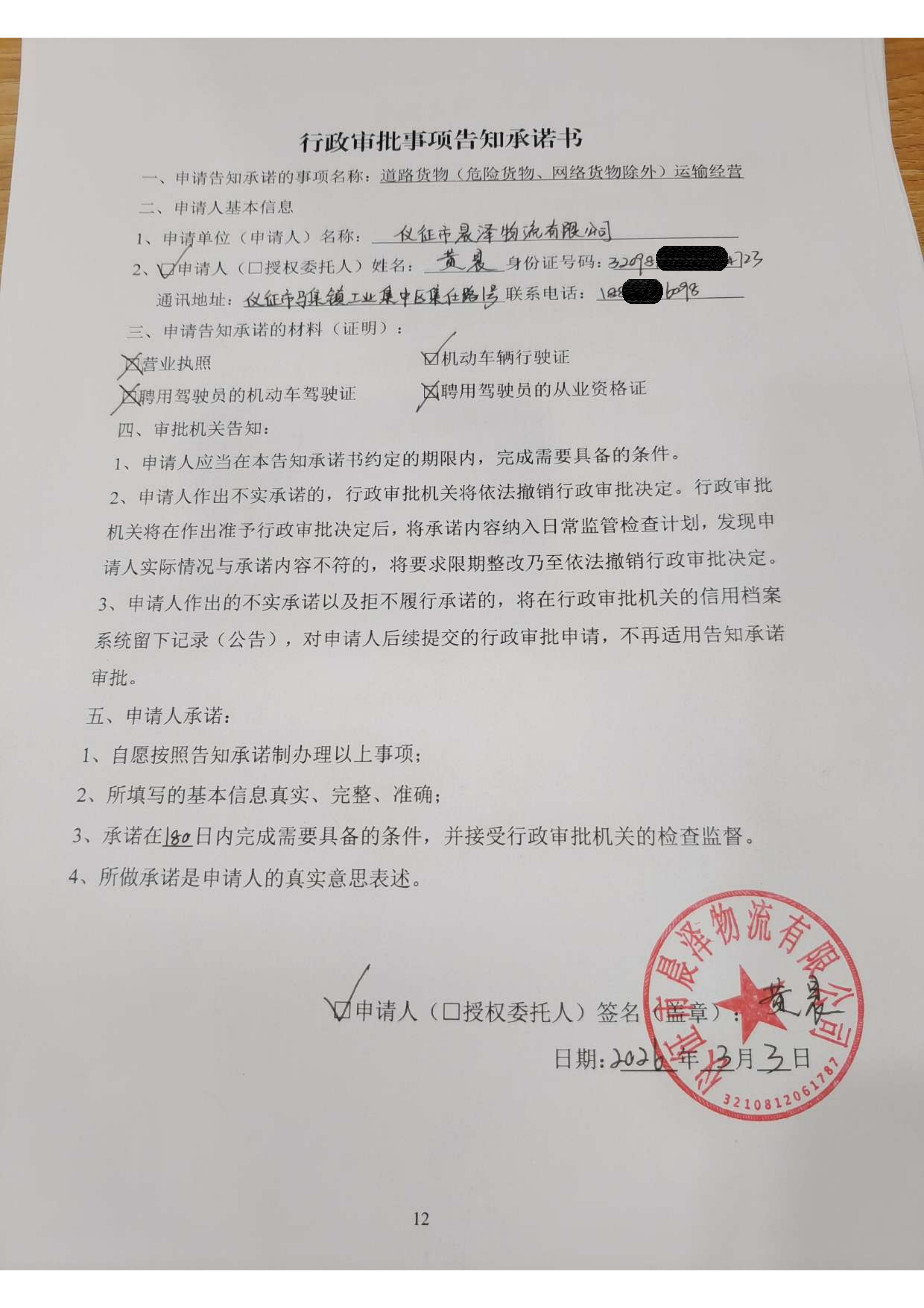 扬州市仪征市晨泽物流有限公司交通运输行政审批告知承诺书