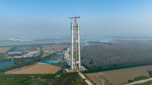 张靖皋长江大桥北航道桥南、北主塔主体施工全部完成