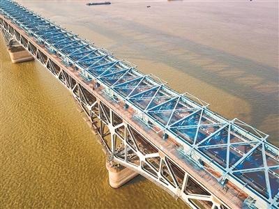 昨日,空中俯瞰维修中的南京长江大桥,原本的桥面钢结构基础已经全部被刷成了蓝色,仿佛一条蓝色巨龙。目前大桥上部结构梁除锈出新工程全面完成,新涂装的淡蓝色防锈漆让桥梁焕然一新。 通讯员 余信雄 新华报业视觉中心记者 宋 峤摄
