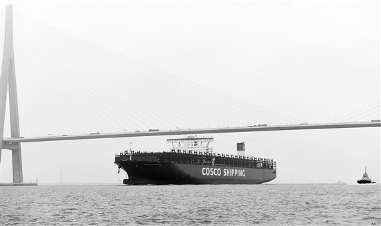 日前,由我国自主设计、建造的2万标箱集装箱船舶“中远川崎231”轮停靠江苏南通港中远钢结构码头上,打破了长江航运史上通航船舶最大尺寸的纪录。 “中远川崎231”轮总长400米,型宽58.6米、型深30.7米,载重吨15万吨,一次可装载2万个20英尺标准集装箱。由于船身较大,船舶航行和靠泊作业期间存在安全风险,南通海事局邀请气象、水文、通航等领域专家对通航安全进行评估论证,出动4艘大马力拖轮和11艘海巡艇进行护航。 驻江苏首席记者 施科 文 通讯员 王开耀 图