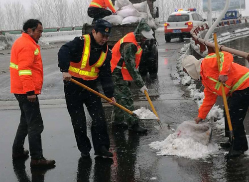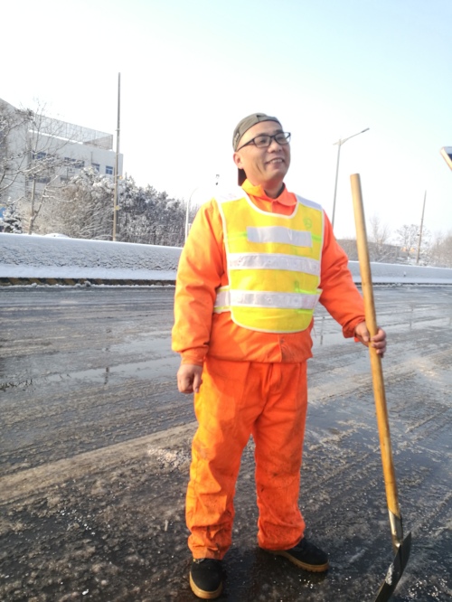 “爱路、护路、养路,为人民服务!这是我们的职责,我们的使命!”伴随着过往车辆的鸣笛致意,连云港公路部门的入党积极分子陈亮看着远去的车辆自豪地说,他的橙黄色工作服裤腿、袖口上布满了泥点,浑身散发着融雪剂的刺鼻气味,“融雪剂有腐蚀性,沾到身上确实不舒服,但是不管怎样我们都要完成任务,确保桥梁、道路安全畅通!”