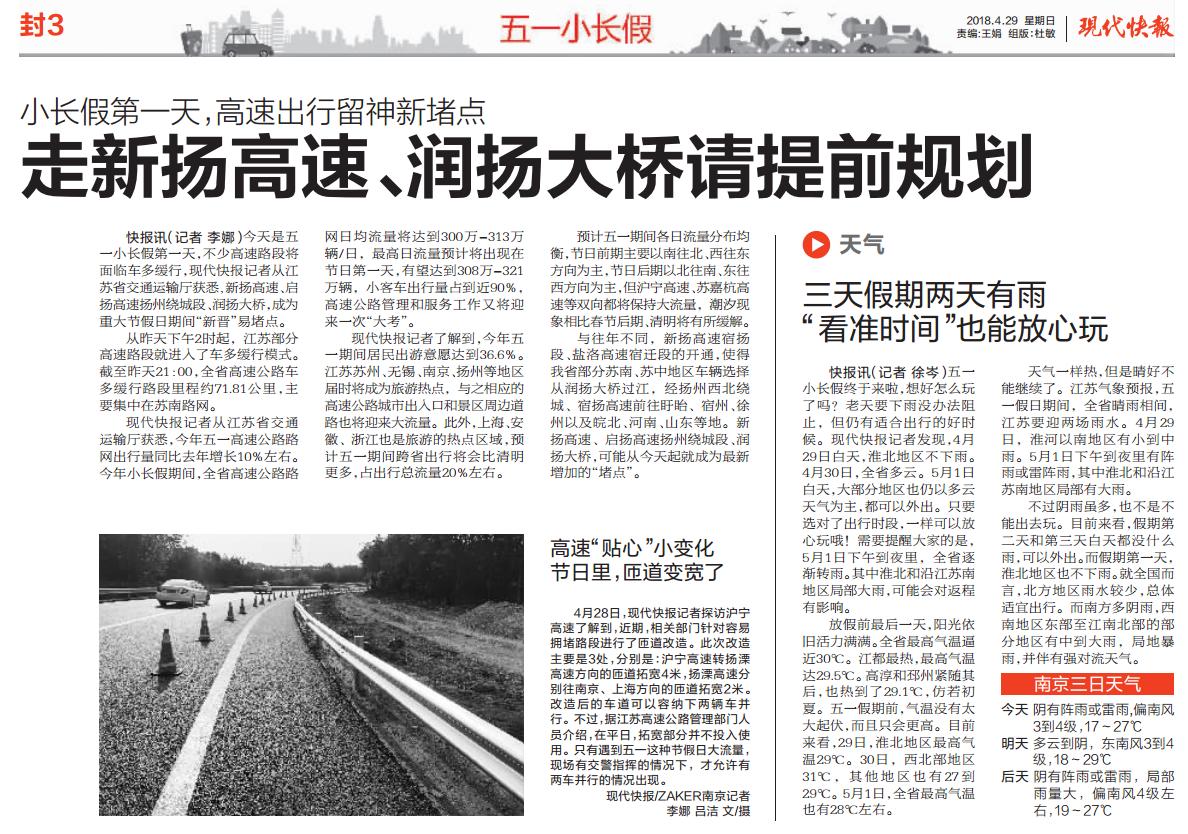【现代快报】小长假第一天,高速出行留神新堵点 走新扬高速、润扬大桥请提前规划