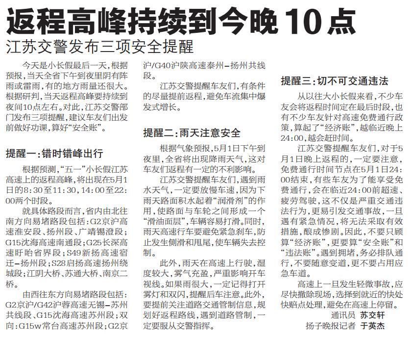 【扬子晚报】返程高峰持续到今晚10点