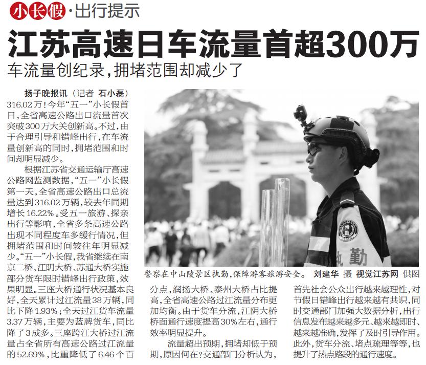 【扬子晚报】江苏高速日车流量首超300万