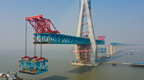 架梁作业是沪通长江大桥主体结构施工的关键阶段,也是集中体现大桥自主创新实践中新结构、新材料、新装备、新工艺的关键阶段。在这一阶段,箱桁结构、公铁共用的钢梁,Q500特种桥梁用钢,量身定制的1800吨的专用的架梁吊机、大节段(两个标准节段)架梁,都代表了中国桥梁技术的新跨越。