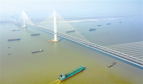 江心洲长江大桥是世界上首座轻型钢混组合结构斜拉桥,设计为全线双向六车道,全长约10.3公里。从此,南京市民从河西到江北新区仅需10分钟即可过江。杜 懿摄(新华社发)