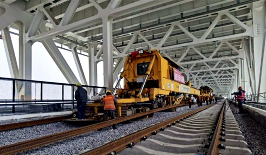 4月22日下午5时许,经过大桥建设者连续7天的奋战,随着两台铺轨机“吐出”最后一组轨枕并完成钢轨牵引,镇江五峰山长江大桥连镇线双线轨道正式拉通。