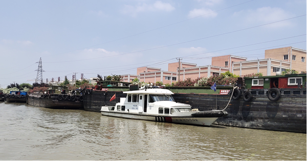 架线工程结束后,海事人员有序放船。由于重船吃水较深以及航道狭窄,多艘船舶面临搁浅无法通行。海事人员驾驶摩托艇一边维持秩序一边指挥船舶操作,经过3个小时的不懈努力,航道恢复畅通。(周伊 宋朱瑜)