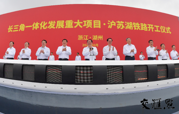 6月5日上午,长三角一体化发展重大项目·沪苏湖铁路开工仪式在浙江湖州举行。该铁路上海段、江苏段建设动员会同步举行,安徽扬马城际铁路马鞍山枢纽工程同步开工。这是长三角一市三省首次联合举行重大项目开工活动,拉开了2020年长三角地区主要领导座谈会帷幕。