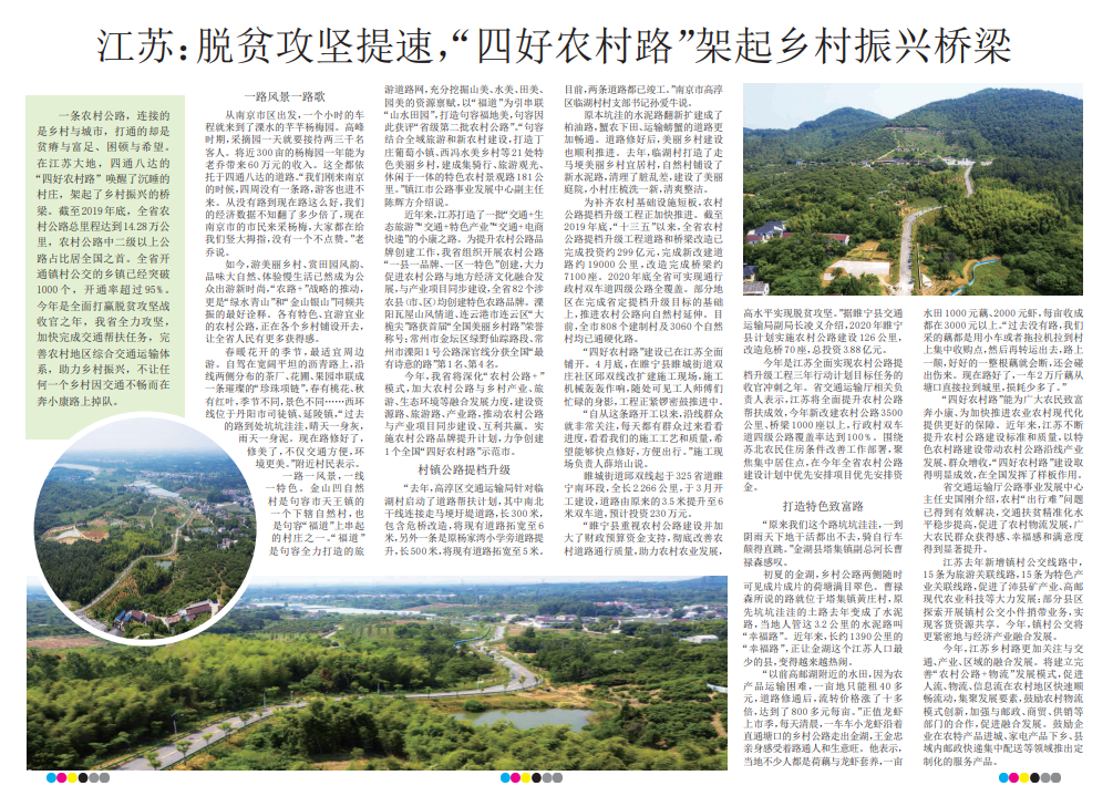 “四好农村路”能为广大农民致富奔小康、为加快推进农业农村现代化提供更好的保障。近年来,江苏不断提升农村公路建设标准和质量,以特色农村路建设带动农村公路沿线产业发展、群众增收,“四好农村路”建设取得明显成效,在全国发挥了样板作用。